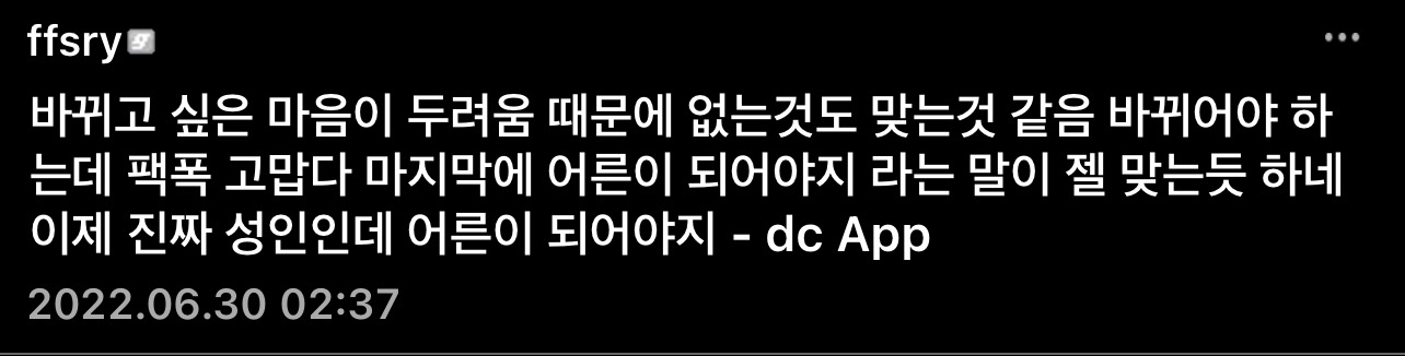 고민페이즈는 삶의 과정이지만 그것이 끝도 없이 지속되면 삶과 심리에 여러가지 큰 문제가 생긴다. 고민하는 인간은 가능성만을 내포한 상태이고 가능성이 실현된 상태가 아니고 열등한 상태기 때문에 많은 심리적 문제를 동반해. 애벌레는 때가 되면 나비가 되어야 하고 하늘을 날아야하는데 나비가 못된다면 애벌레로 살아가는 삶이란 나비가 되었어야할 시기를 맞이하고 그 시기를 넘어섬에도 여전히 애벌레인 상태라면 그리고결국 못난다면 기나긴 지옥의 삶이 시작될거야. 고통은 누구도 대신 받아주지도 끊어주지도 않아. 동정해주지도않고 나눠받을수도 없고 너가 어떤 심리적 문제들이 있는지는 나열하지 않겠어 너가 잘 알잖아. 평생 고민만 할 수는 없어. 평생 피터팬이 될 수 없고 네버앤드에서도 영원히 살수가 없어. 어른이 돼야지. 고민을 끝내고 선택하고 자신의 선택을 견대낼 수 있는 어른이 되길 기도한다.