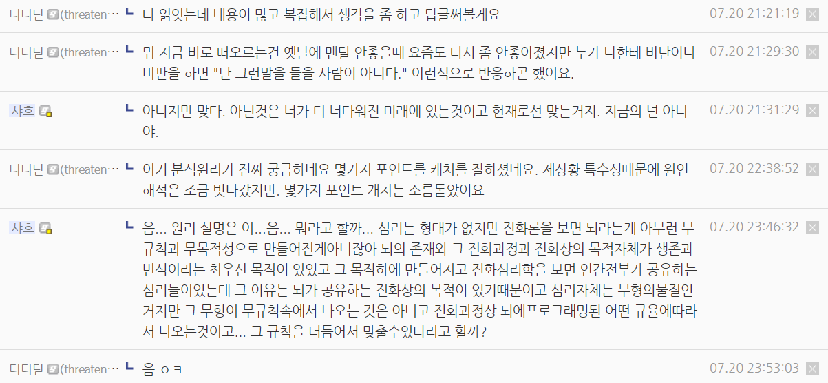 결국 너가 영원히 이 상황이 타개되지 않을 거라 믿는 것은 과거로 부터 박힌 생각이 아니야. 너가 스스로 동굴 속에 박혀서 안나오기 때문에 더 강화되고 고착화되고 있는거야. 그런데 그걸 과거의 탓으로 넘기고 있는거지. 미래는 스스로 만드는 것이고 현재와 미래에 대한 책임은 과거게 있지 않아 자기자신에게 있는거야. 과거는 과거에게만 책임이 있다. 너의 과거의 고통과 불행은 과거탓이라고 할 수 있으나 현재와 미래에 대한 고통과 불행은 너의 책임이다. 너가 앞으로도 동굴수련자에 지나지 않고 이렇게만 살아간다면 나는 너를 혐오할 것이다. 영원히. 그런 사람은 디스커스팅이야. 너가 쓸모없는 짓거리를 쓸모없다고 깨닫고 동굴에서 나오고 위대한 사람이 된다면 신도 너를 축복하지 않을 수 없다. 나또한 조아릴 것이다. 역겨운 프라이드에서 위대한 프라이드를 갖기를 기도한다.