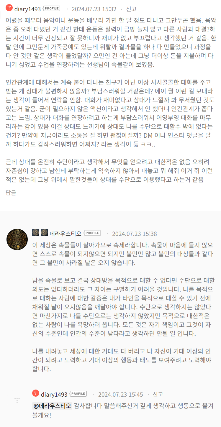 너가 먼저 진정한 인간이 되어야만 너는 진정한 인간들이 너 곁에 있기를 요구할 수 있고 실현할 수 있다. 너가 타인을 대할때 얼마나 진정하면서 진정한 인간을 바라는 것인지 양심적으로 되돌아보길 바라고 너가 너의 삶을 얼마나 진정히 대하면서 진정한 행복을 바라는지도 양심적으로 되돌아보길 바란다. 너는 속물이고 기화주의자이고 아무 것도 목적으로 생각하지 않으면서도 너는 누군가의 목적이 되고싶어 한다. 그 일방적이고 이기적인 바람은 결코 이뤄지는 법이 없다. 직원을 일방적으로 의리테스트하는 편의점 점장처럼 그 힘에 굴복하는 비루하고 수준낮은 인간들만이 남던가 제 스스로 날 수 있는 나비들은 전부 날아가 버린다. 너가 이런식으로 인간을 대한다면 너의 친구, 애인, 가족, 자식의 수준은 너의 힘에 굴복하고 스스로는 날 수 없는 수준낮은 애벌레에 지나지 않을 것이다. 너의 테스트를 통과한 인간들이란 진정한 인간이 아니고 너에게 굴복한 비루한 인간들 이기 때문이다. 남을 시험하지 않는 것이 너에게 주어진 신의 시험이다. 너 먼저 시험을 통과하고 진정한 인간으로 거듭나길 기도한다.